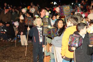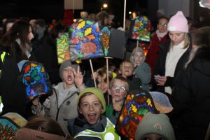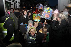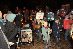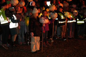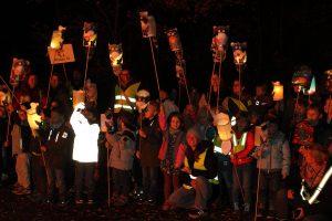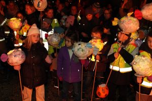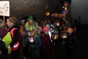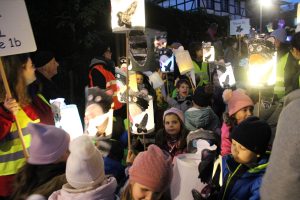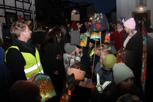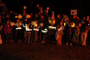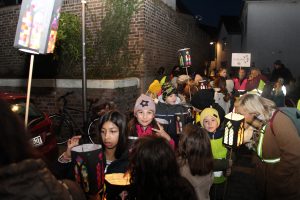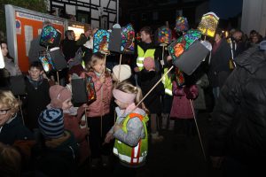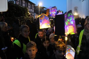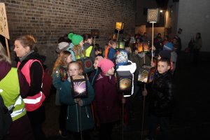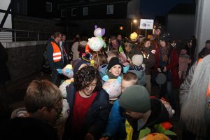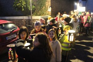 … leuchten die Laternen wieder“.  So sangen die Kinder der Grundschule und des Kindergartens beim diesjährigen St.-Martins-Zug. Dieser ging auch in diesem Jahr über Badorfer Straße, Obermühle und Hüllenweg bis zum Schützenplatz, musikalisch unterstützt durch Musikkapellen. Um 17:30 ging es an der Kirche los, angeführt wurde der Zug von unserem neuen St. Martin, Manfred Giefer auf einem weißen Pferd.