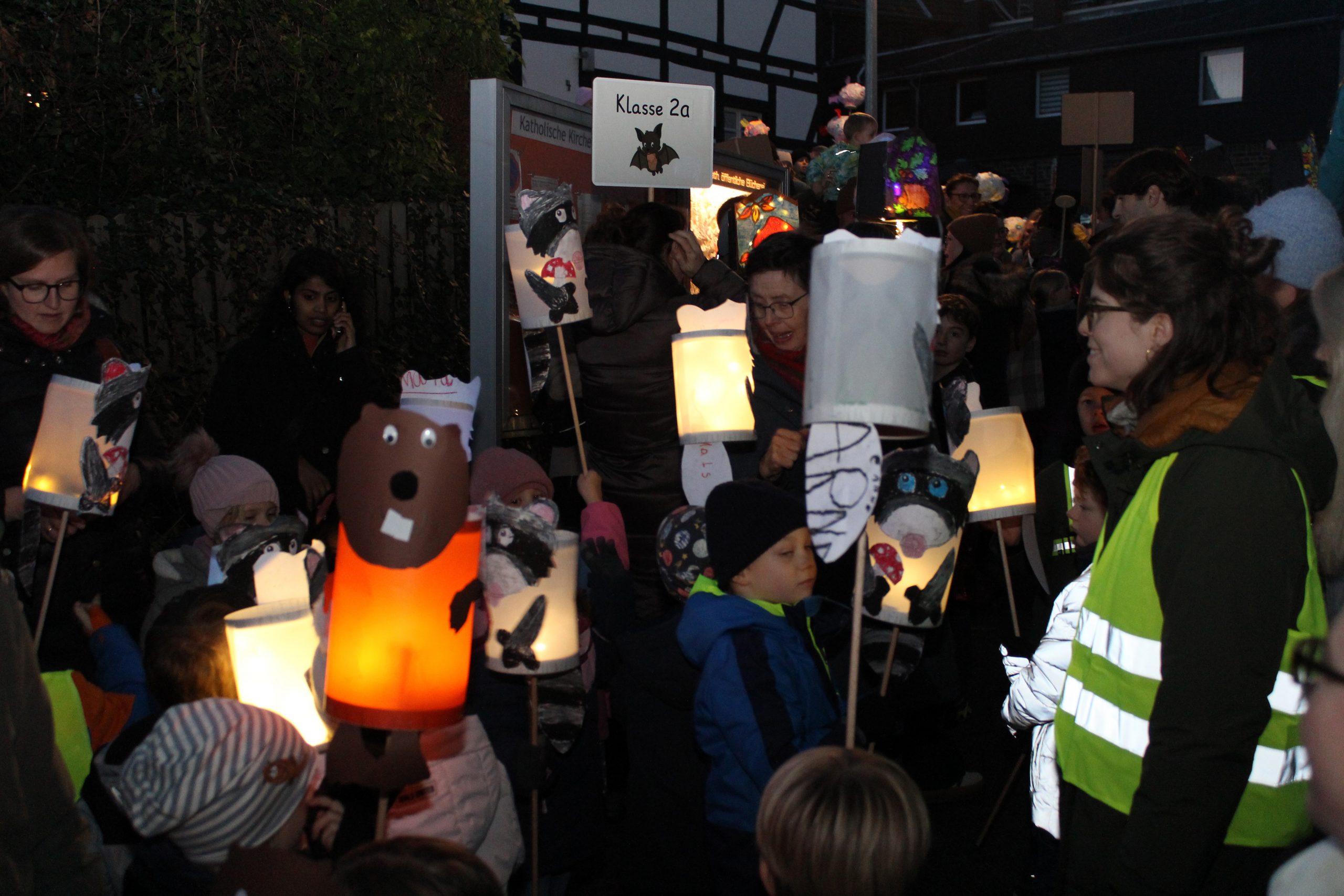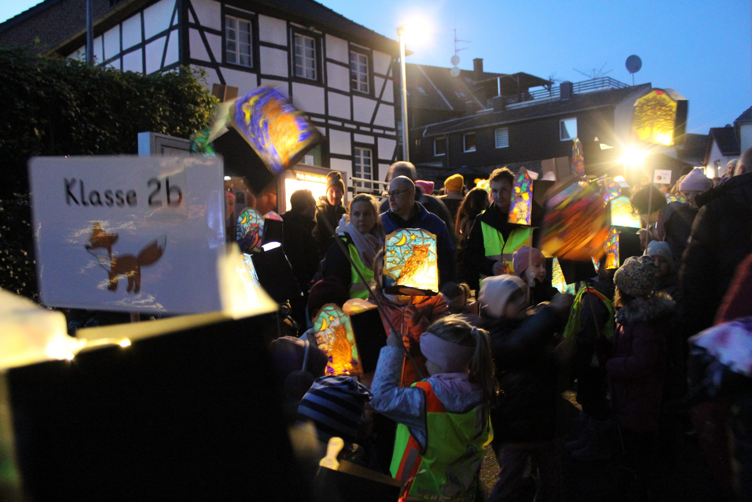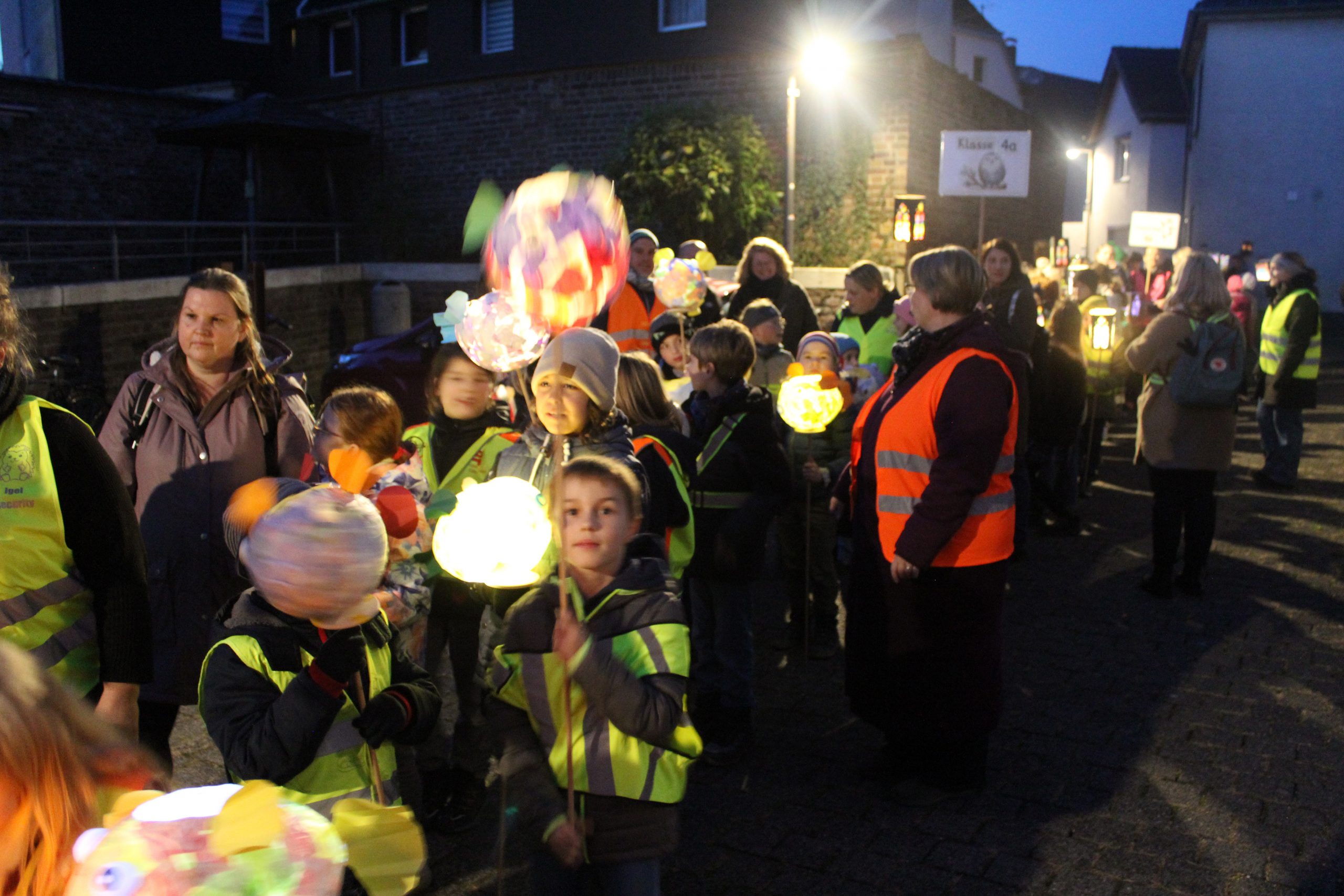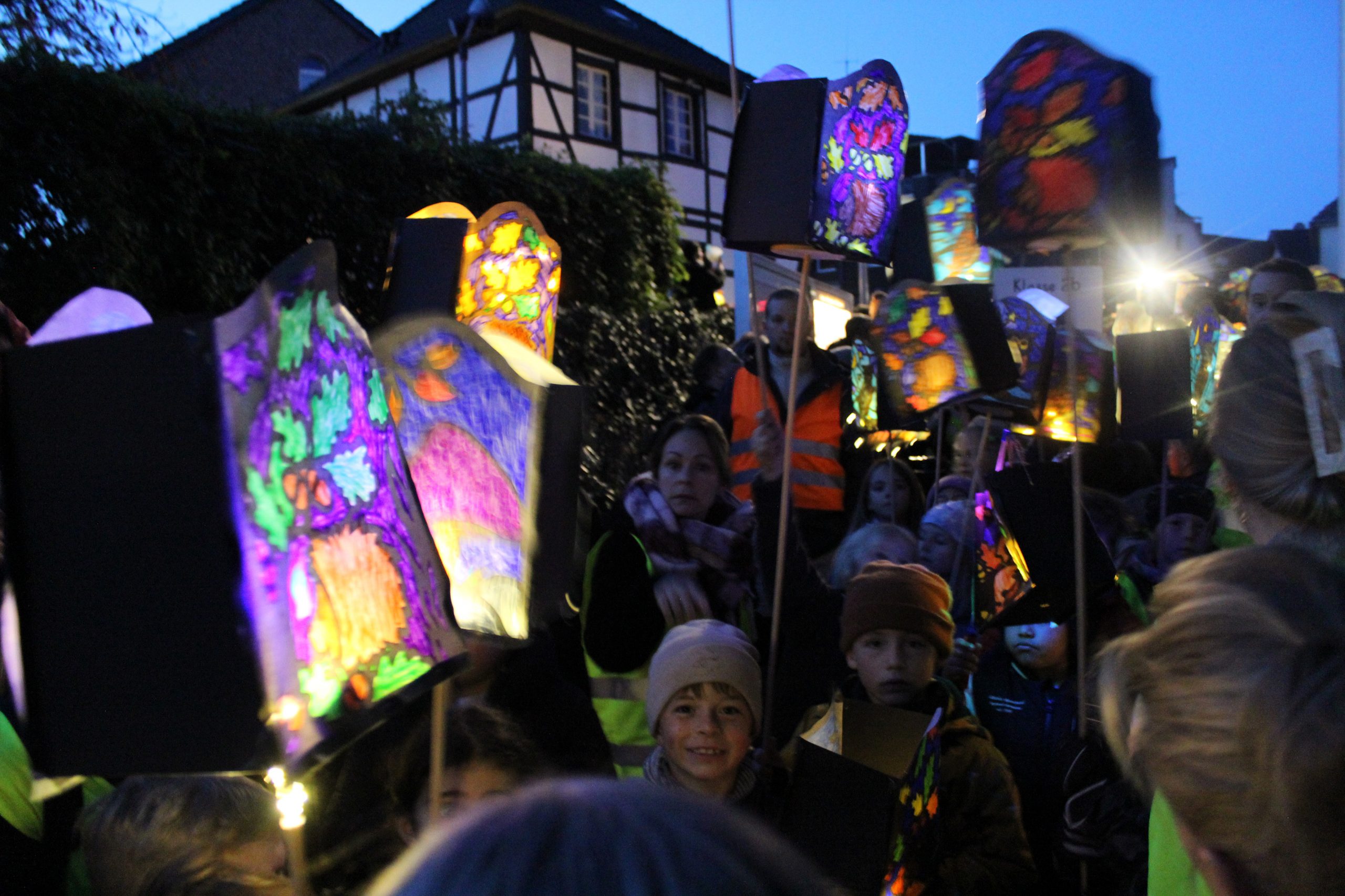 … leuchten die Laternen wieder“.  So sangen die Kinder der Grundschule und des Kindergartens beim diesjährigen St.-Martins-Zug. Dieser ging auch in diesem Jahr über Badorfer Straße, Obermühle und Hüllenweg bis zum Schützenplatz, musikalisch unterstützt durch Musikkapellen. Um 17:30 ging es an der Kirche los, angeführt wurde der Zug von unserem neuen St. Martin, Manfred Giefer auf einem weißen Pferd.